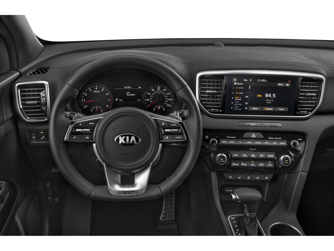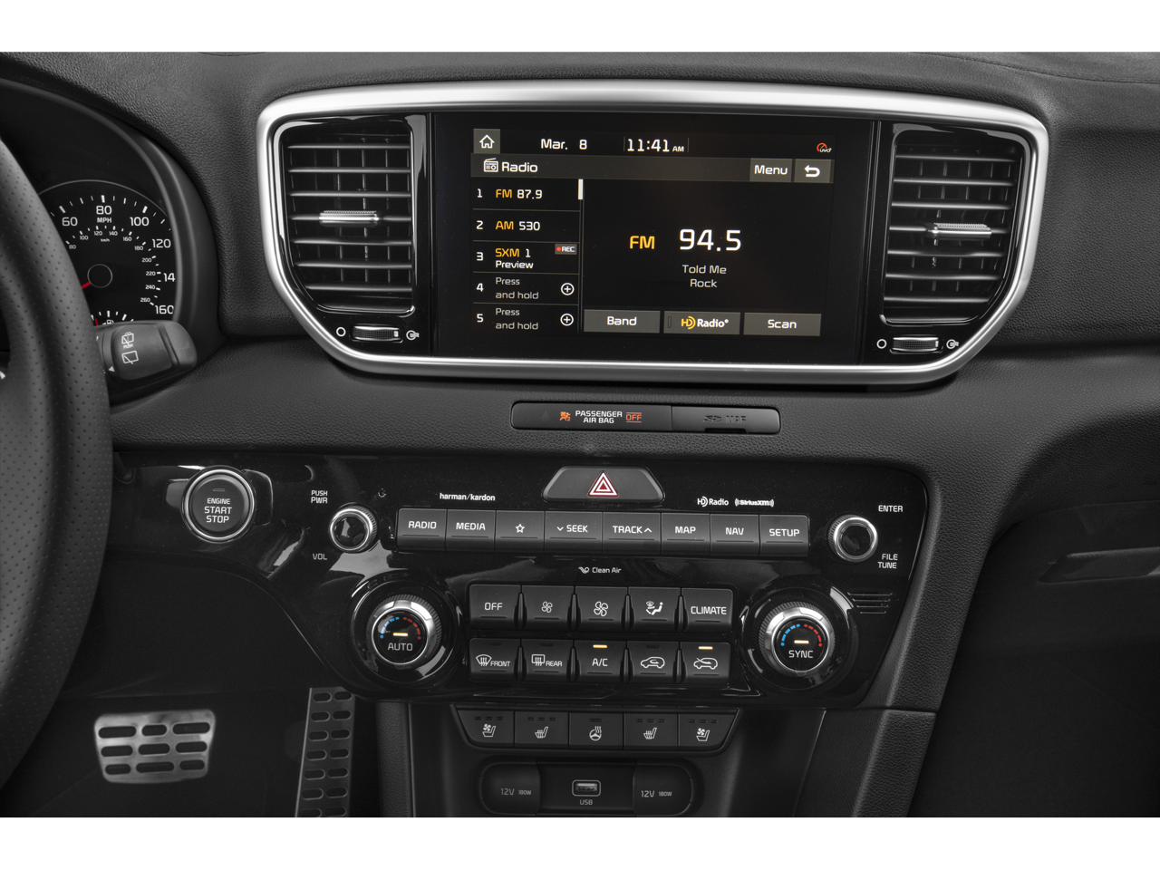 - Radio: AM/FM/SiriusXM Audio System -inc: 8" touchscreen, navigation, 8 speakers including subwoofer, 320 watt harman/kardon premium audio, Clari-Fi, UVO telematics, Apple CarPlay & Android Auto, voice recognition, USB/aux input ports, wireless phone charging, steering wheel controls and Bluetooth w/audio streaming
